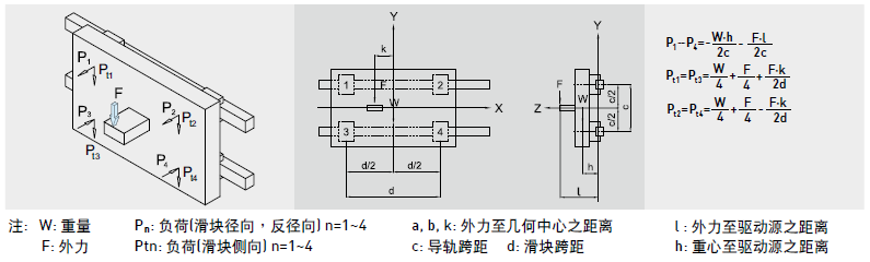 工作負荷的計算方式會隨實際受力分布的情形而產生變化,例如承載物體本身重心的位置、施力的位置,以及運行時起動、停止的加速度慣性力等皆對負荷的計算發生影響,因此使用直線導軌時必須仔細考慮各種負荷狀況,以計算出最正確的負荷值。