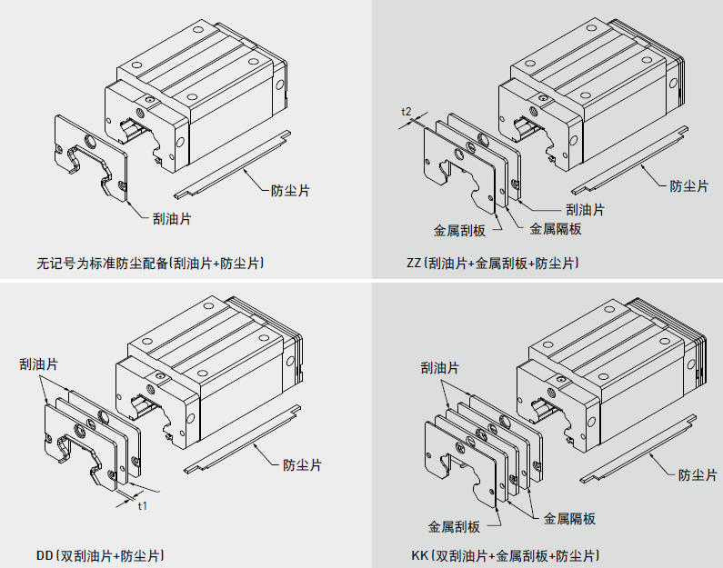 HIWIN特別針對具有粉塵顆粒之嚴苛作業環境,如木工機械、玻璃/石墨加工等設備,開發具有超高防塵功能之特殊配件,實現超高防塵性能。若有下列高防塵配件需求時,請于產品型號后面加注代碼。