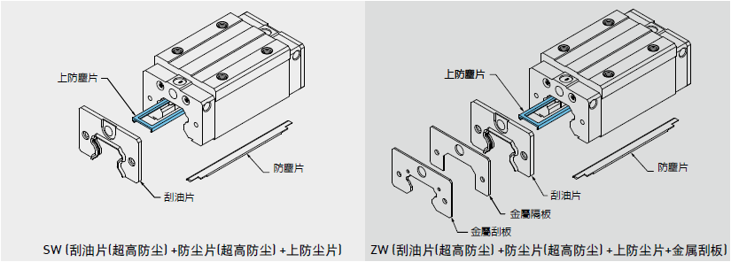 HIWIN針對較一般環境嚴苛之作業環境,開發強化高防塵功能之防塵配件,若有下列高防塵配件需求時,請于產品型號后面加注代碼。