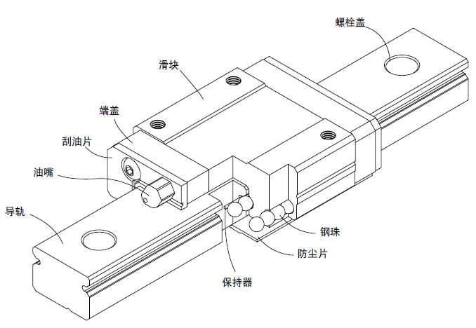 滾動循環系統:滑塊、導軌、端蓋、鋼珠、保持器
