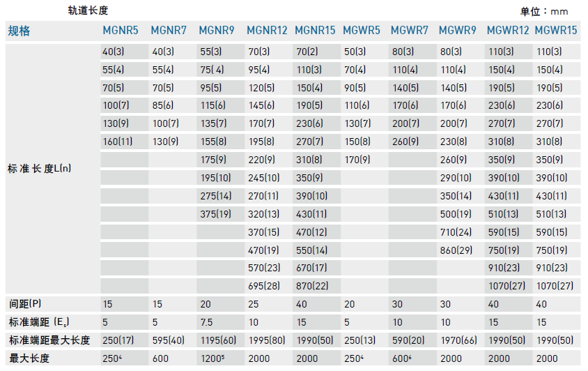 4. MGNR9不銹鋼導軌提供最大長度為1200 mm;MGNR9一般鋼導軌提供最大長度為1000 mm。