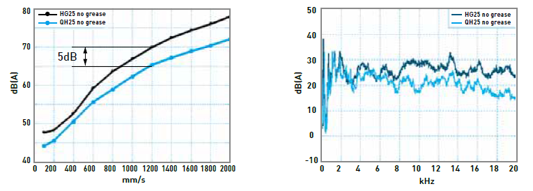 利用同步聯結器可使滾珠均勻等間隔的排列,滾珠與滾珠間的相互撞擊金屬聲消失,尖銳的高頻聲音強度有效降低(見右下圖)。總和的聲音強度與舊有系列比較在各個速度域有效降低約5分貝(見左下圖)。