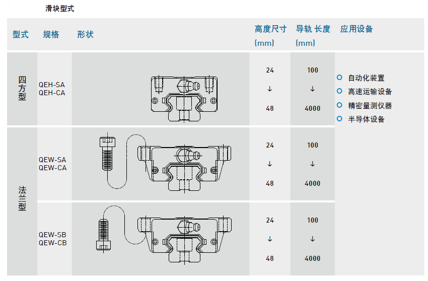 直線導軌QE靜音系列之導軌和滑塊型式