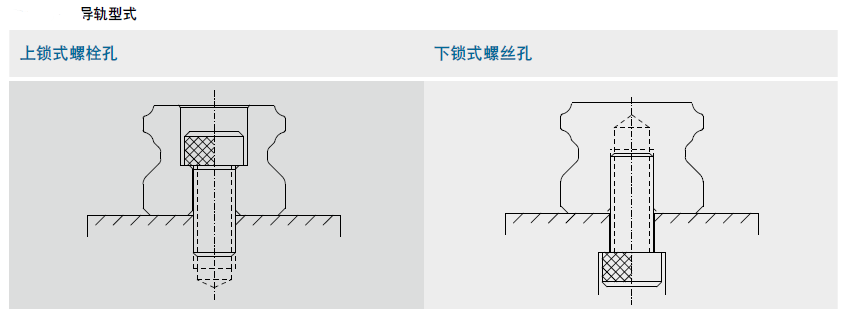除了一般上鎖式螺栓孔導軌外,HIWIN亦提供下鎖式螺絲孔導軌,方便客戶安裝使用。