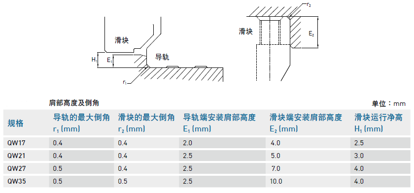 3、安裝注意事項, 我們在超導軌的時候,要注意安裝面肩部高度及倒角,安裝直線導軌時必須注意安裝面肩部的狀況是否適當,如倒角過大,凸出的地方易造成直線導軌精度不良,而高度過高則會干涉滑塊。故如果能依照建議要求安裝面肩部,安裝精度不良即可排除。下表為QW靜音安裝面肩部高度及倒角相關參數。
